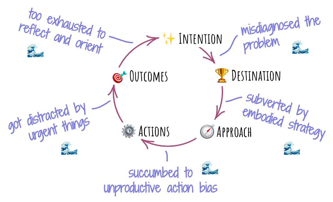 이 과정의 각 단계마다, 우리의 의도와 결과 사이를 어긋나게 만들 수 있는 여러 가지 오류가 숨어 있다. 우리는 종종, 우리가 이해한 상황을 마치 실제 현실처럼 받아들이고(“보이는 것이 전부다”), 진단이 사실이 아니라 가설에 불과하다는 점을 잊곤 한다. 또한 조직 안에 뿌리내린 습관, 문화, 관행들, 즉 ‘몸에 밴 전략(embodied strategy)’에 이끌려, 진단에 맞는 새로운 방법이 아닌 익숙한 방식을 고집하게 되기도 한다.