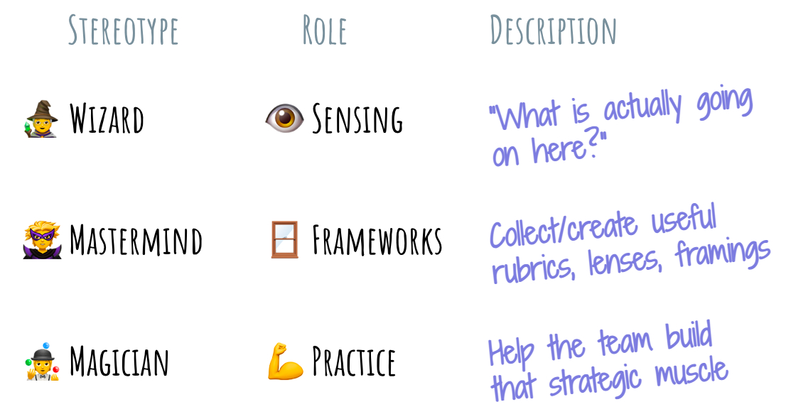 이 글에서는 전략적인 일을 하는 사람을 "전략가(strategist)"라고 부르겠다. 환경에 따라 이건 공식적인 역할일 수도 있고, 리더나 매니저, 또는 개별 구성원이 맡는 일의 일부일 수도 있다.