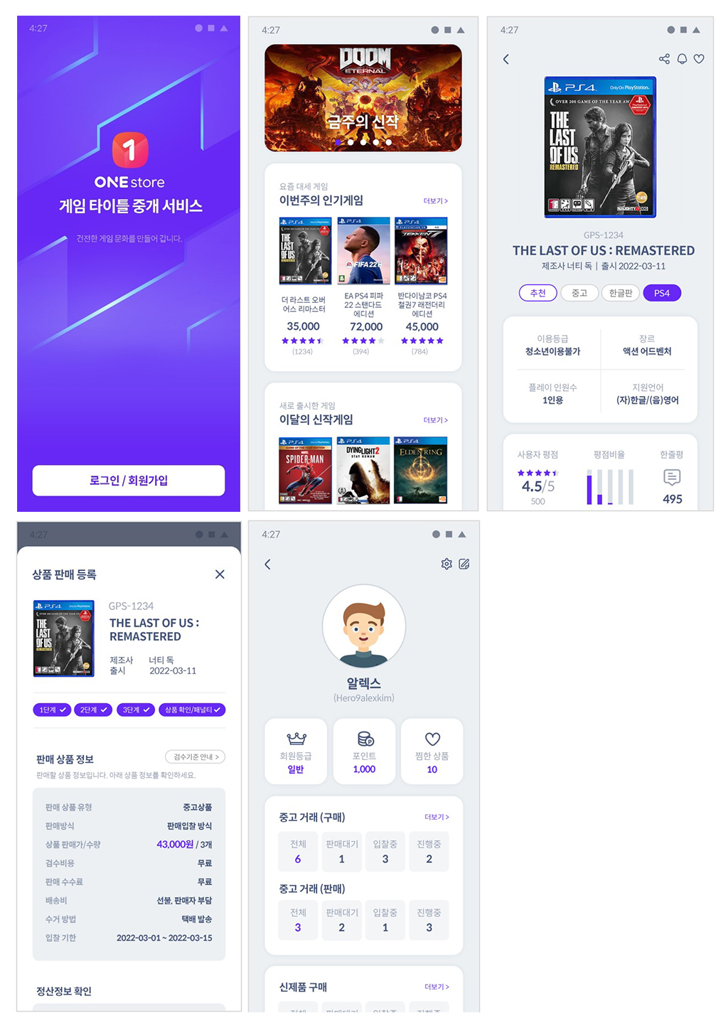 ONESTOE 중고 게임 타이틀 중개 플랫폼 기획안 작성 및 콘셉트 디자인 화면 작업